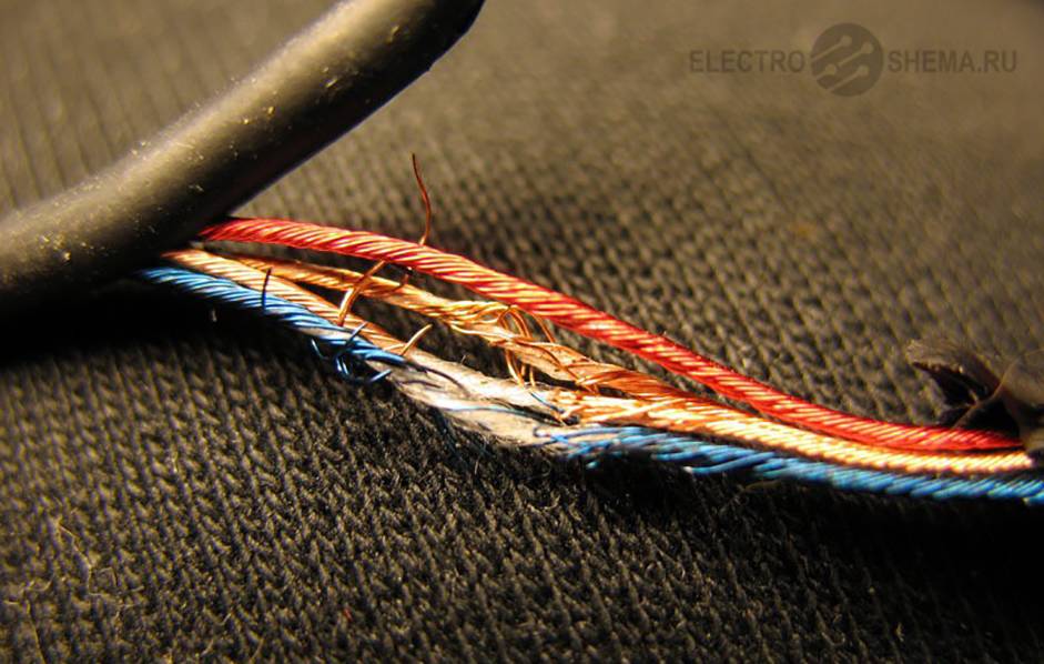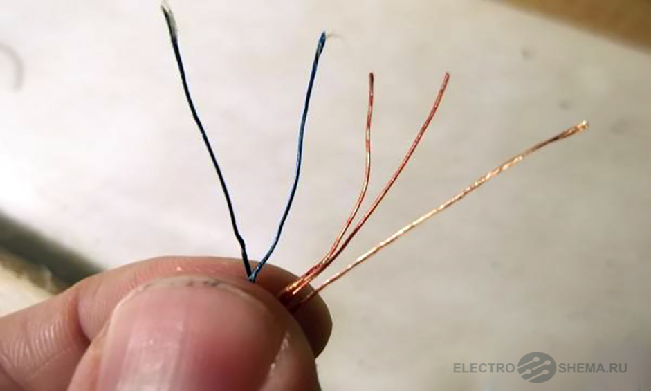 - снимаем изоляцию, так чтобы не повредить жилы. В результате мы увидим четыре провода, два из которых будут покрыты изолирующим цветным лаком, а два без изоляции (пример показан на фото);