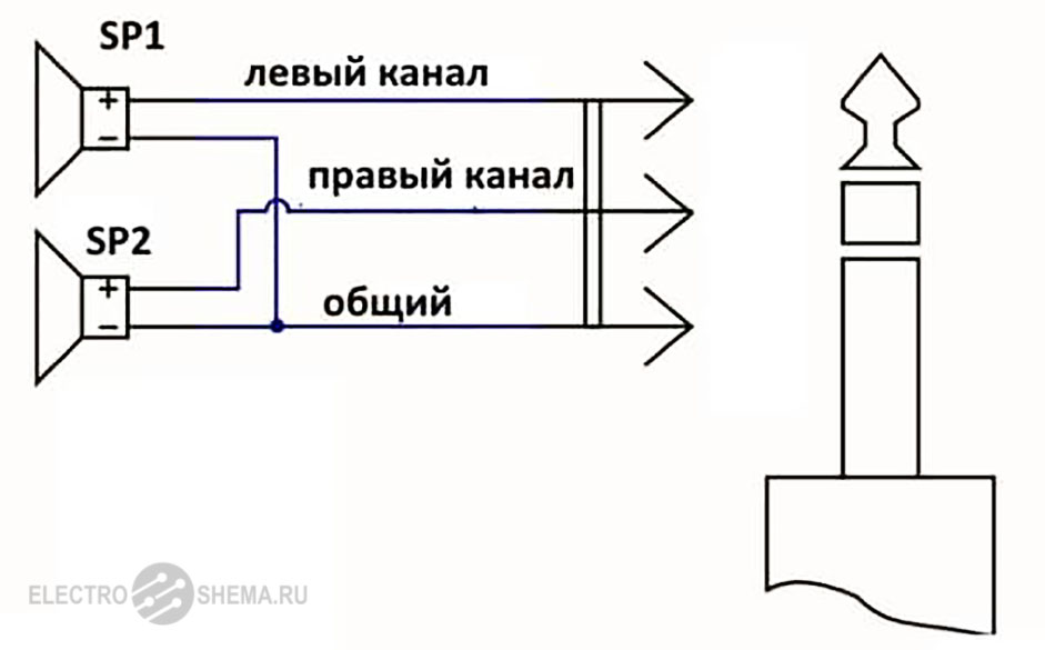 От каждого уха всегда идут два провода – плюс и минус, но иногда производитель объединяет минусы обоих динамиков вместе и получается, что к штекеру приходят всего три провода. Чтобы было понятнее, приведу схему пайки штекера наушников: