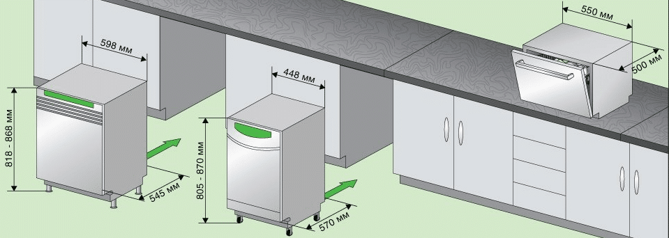 Размеры маленькой, или компактной, ПММ позволяют установить ее в самой тесной кухне. Примерные габариты: