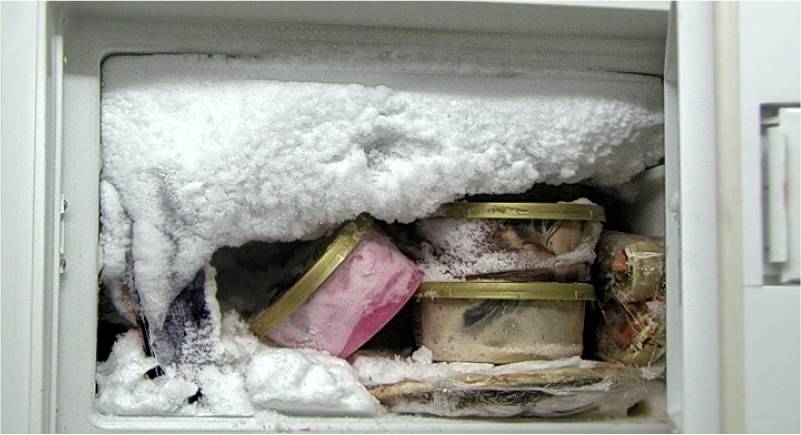 - Дверца морозилки не закрыта полностью. Из-за сильной перегрузки камеры различными продуктами резинка дверцы может прилегать неплотно, пропуская внутрь морозилки теплый воздух извне, что способствует образованию «снега».