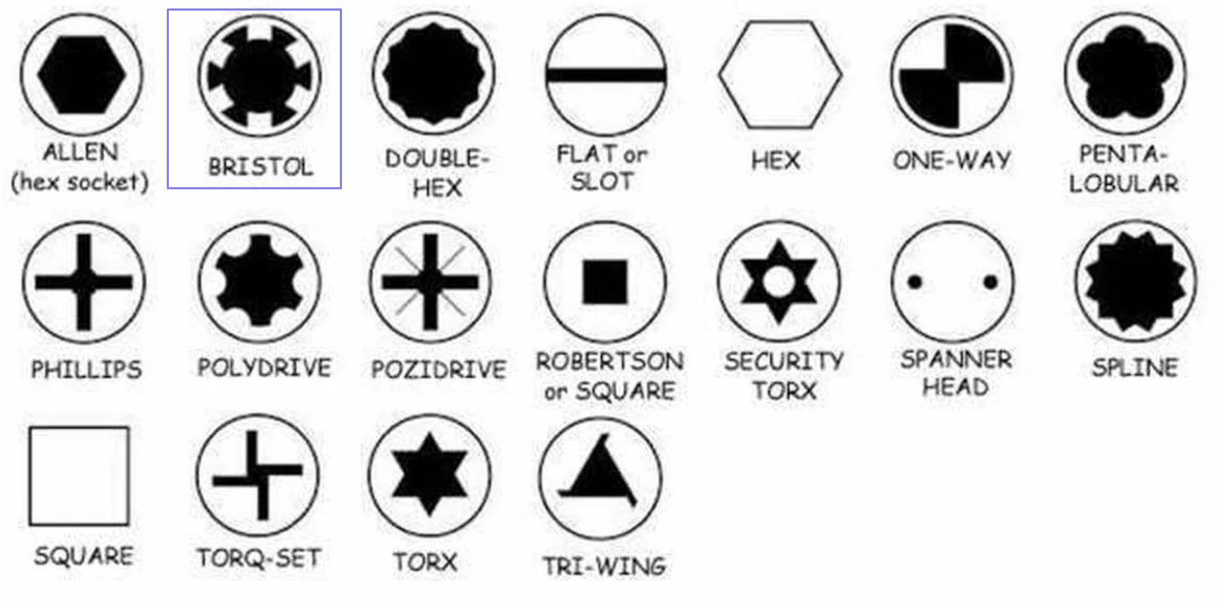 Вообще, «Бристоль» – это условно антивандальный тип, так как его можно открутить обычной плоскошлицевой отверткой. Похож на Torx Plus, но боковые грани не квадратные, а трапециевидные. Подходит для крепления мягких металлов, поскольку не проминает их. Существуют также усовершенствованные виды «Бристоля» со штифтом в центре. Применяется в игровых приставках, телекоммуникационном оборудовании, внешних видеокамерах, военной технике и т.д.