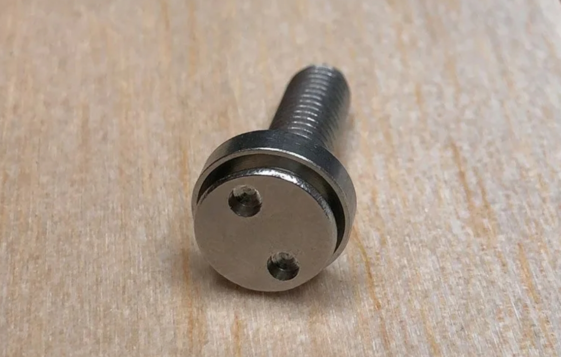 Известен как Snake-Eye из-за особой формы. На шляпке болта расположены два отверстия, для откручивания которых нужна отвертка-вилка. Встретить его сейчас можно в лифтах и некоторых видеокамерах.