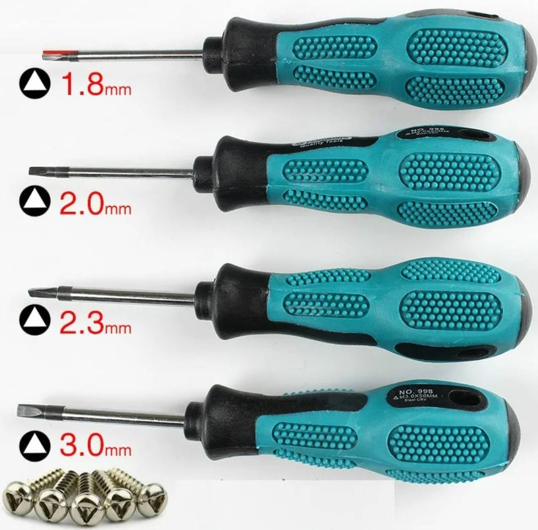 Треугольный шлиц. Простой равнобедренный треугольник. Зачастую используется в кухонной технике и детских игрушках. Антивандальность посредственная, так как откручивается плоскошлицевой или шестигранной отверткой.