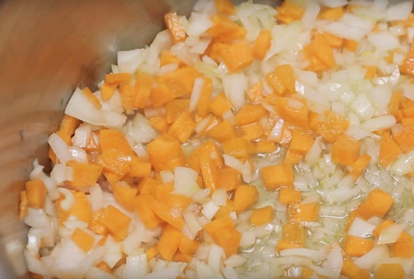 - добавьте 4 г мелко нарезанного лука, 14 г чеснока (выдавите) и 1 покрошенный лавровый лист;