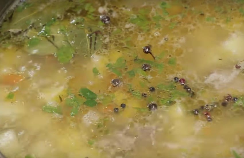 - В кастрюлю нальем литр воды, положим лавровый лист, гвоздику, горошки перцев.