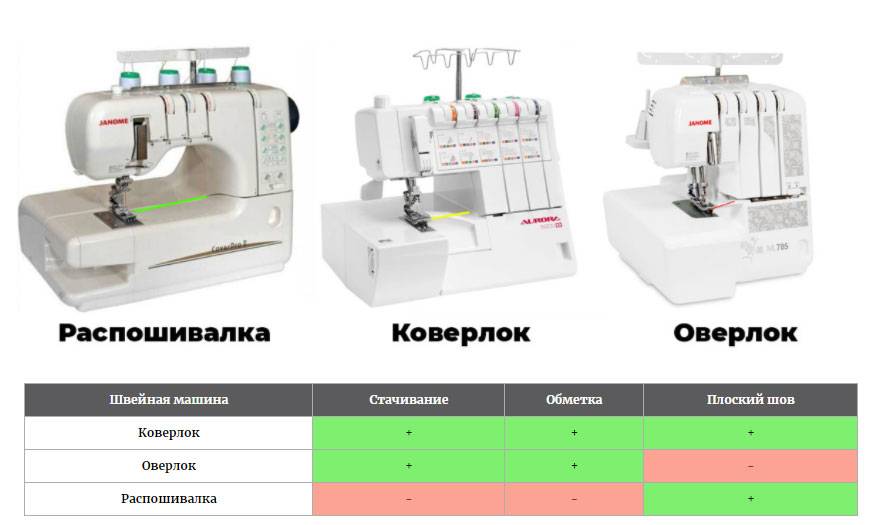 По таблице нам становится понятно, что коверлок сочетает в себе функционал оверлока и распошивалки. Если раньше считалось, что одно устройство не может сочетать в себе два функционала качественно, то в наше время все совсем иначе: качественные коверлоки спокойно заменят две машины, но и цена на них значительно выше, подробнее о нем, вы можете узнать тут.