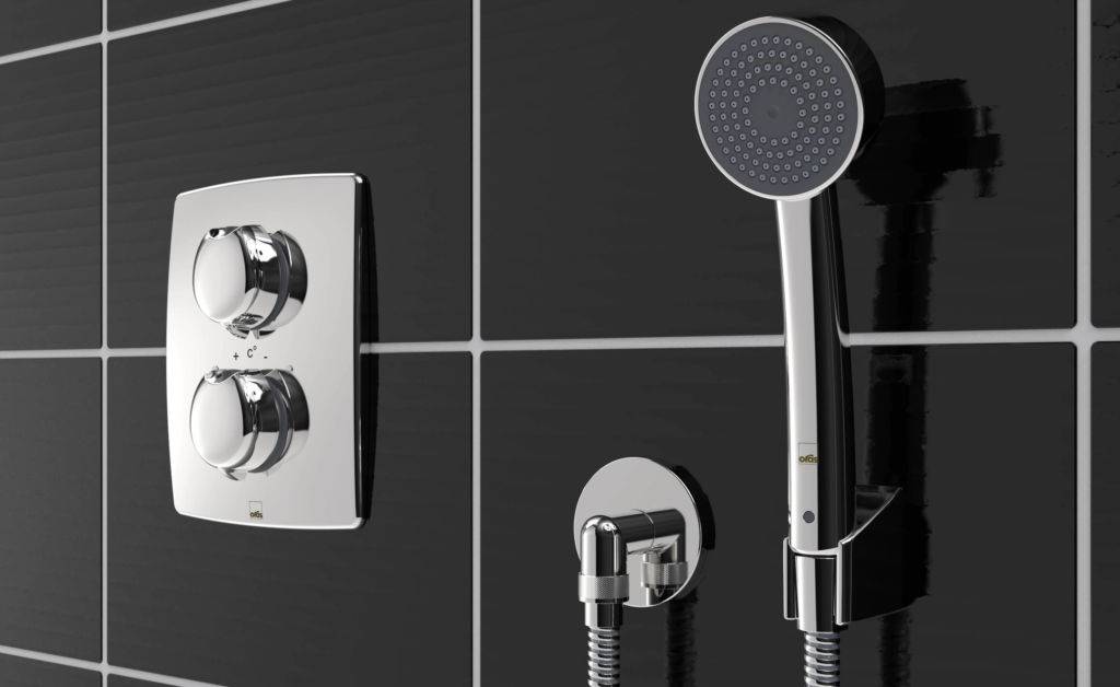 - термостатические. Самые комфортные с точки зрения использования. Они оснащены панелями с рукоятями. Одна нужна для регулировки напора, вторая предназначена для управления температурой;