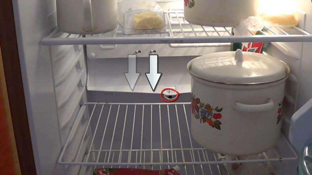 Засор может образоваться из-за попадания в дренаж крошек, остатков пищи и пыли, смываемых с задней стенки каплями воды при оттаивании или при промерзании трубки. Через какое-то время вы сможете увидеть, как холодильник потёк. Если вовремя не устранить засор — в камере появится неприятный запах, а испаритель начнёт покрываться льдом. Поскольку лёд является хорошим теплоизолятором, то компрессору придётся работать практически без остановок, чтобы восстановить установленный температурный режим. Вот так выглядит дренажное отверстие. Стрелочками показано, как сливается вода с задней стенки агрегата и куда она попадает.