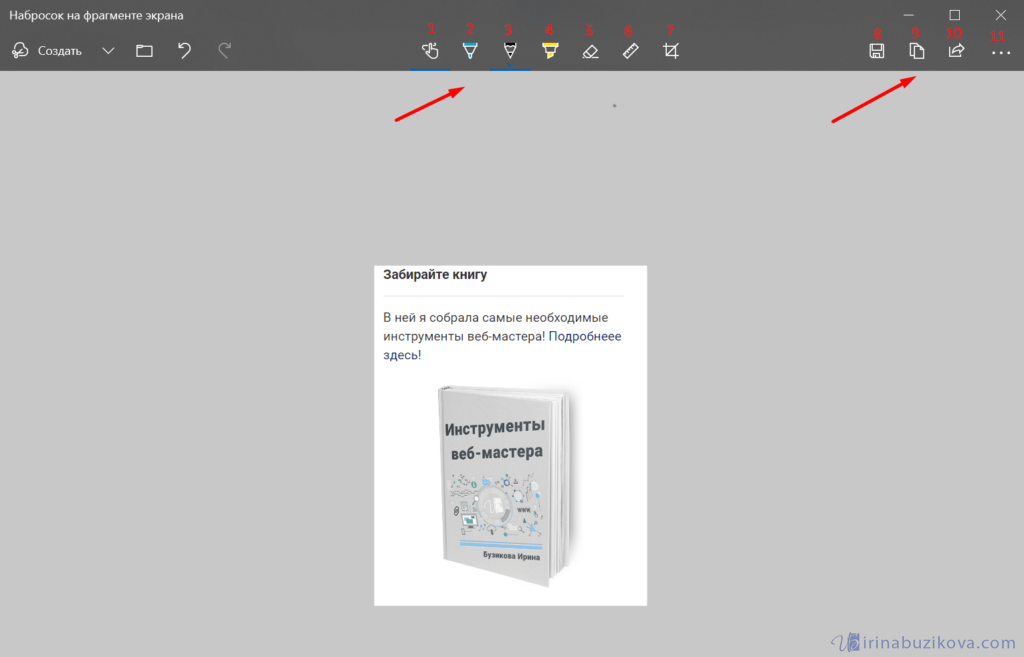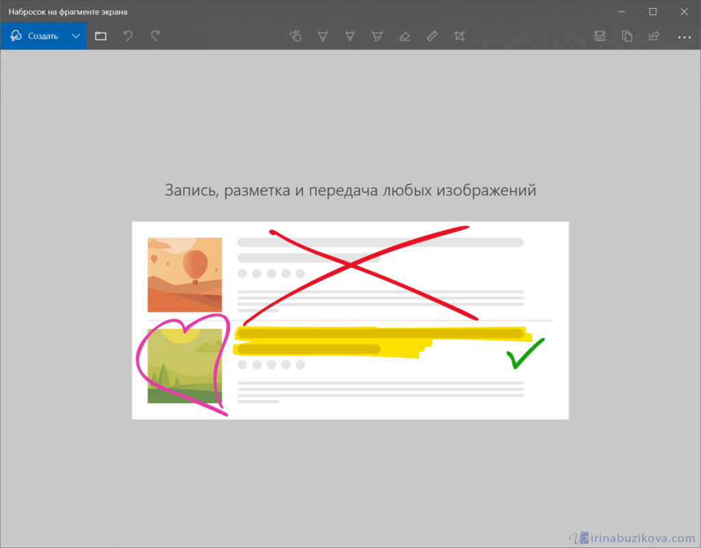 Выбрав нужный элемент, делаем скриншот и автоматически возвращаемся в редактор, где можем внести изменения, например, нарисовать или написать текст.