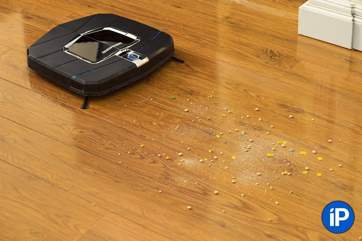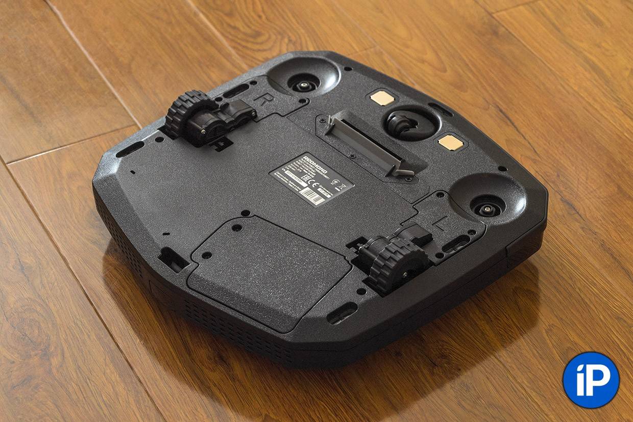 REDMOND RV-R300 способен производить влажную протирку гладких покрытий. Чтобы выполнить этот процесс, необходимо закрепить снизу робота-пылесоса специальную панель с микрофиброй, предварительно намочив её водой.