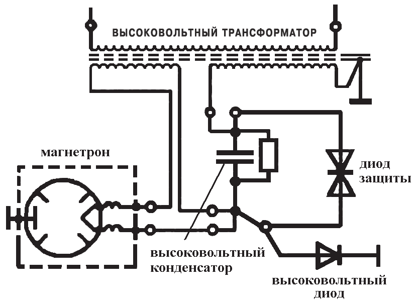 Трансформатор имеет две вторичные обмотки. Одна для разогрева нити накала магнетрона напряжением 3,15 В с током нагрузки до 10 А. Вторая обмотка высоковольтная, выдающая напряжение около 2000 В. С помощью высоковольтного конденсатора C и диода D происходит выпрямление и умножение напряжения до 4000 В, необходимое для работы магнетрона. Предохранитель F2 служит для защиты трансформатора при пробое диода, конденсатора или магнетрона.