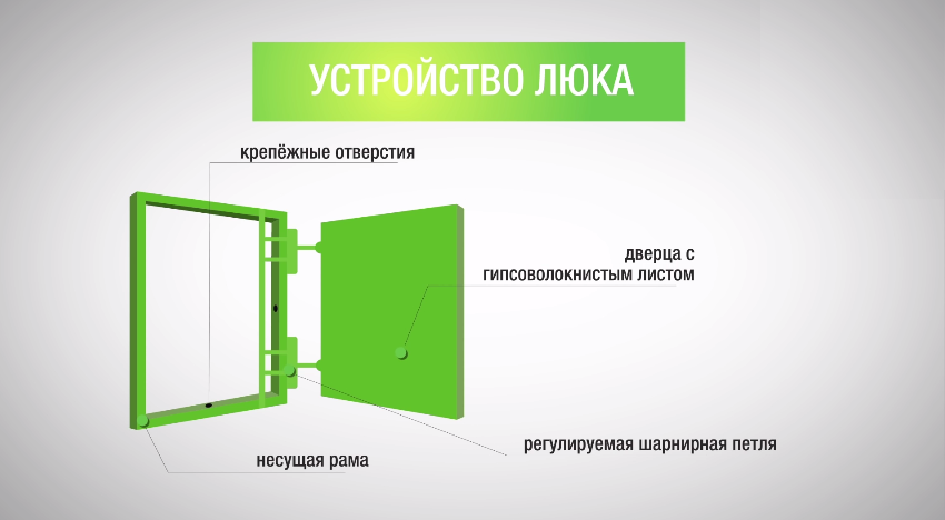 Вне зависимости от способа открывания, места установки, материалов — конструкция ревизионного сантехнического люка остается неизменной.