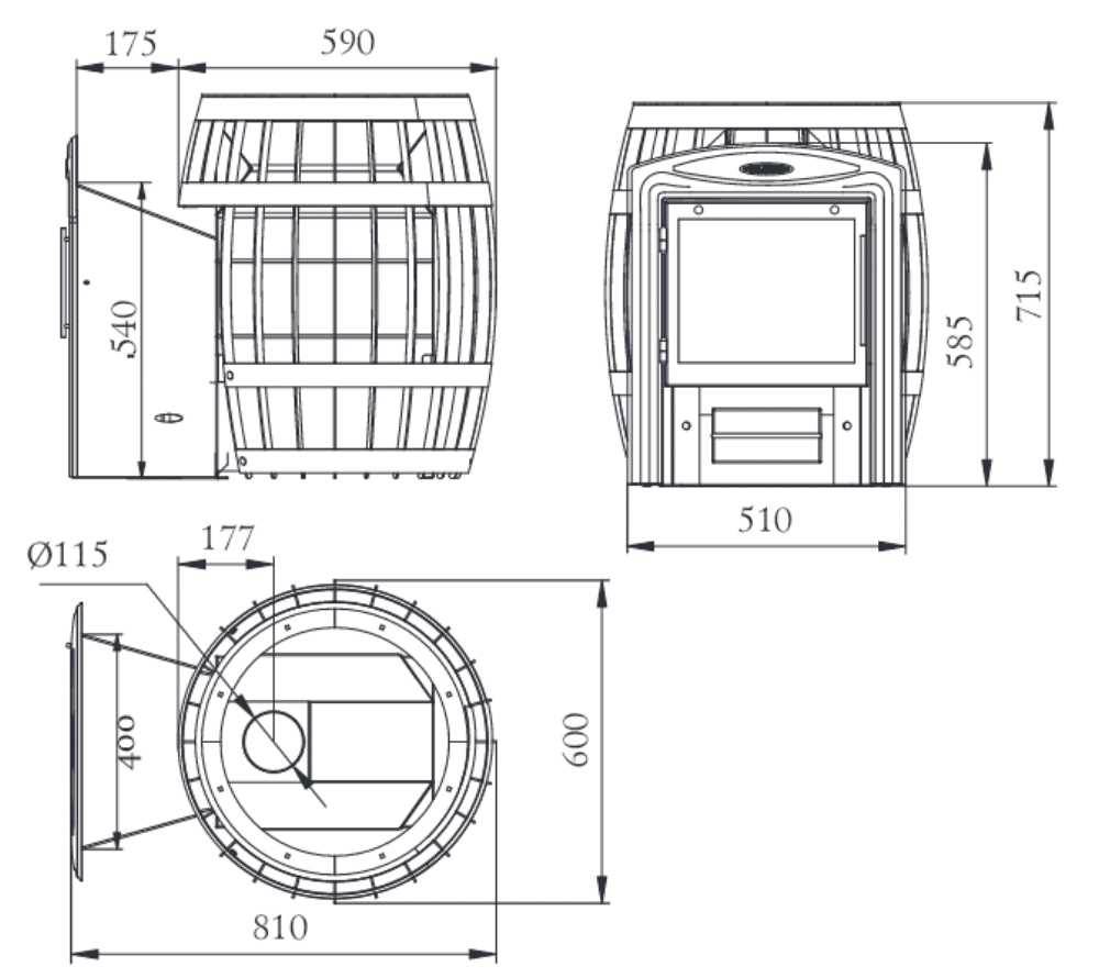 - В верхней части данного устройства вырезается отверстие, чуть смещённое от середины. Размер проёма должен равняться диаметру дымовой трубы. В него вставляется патрубок размером 0,1 метр, для подсоединения дымохода.