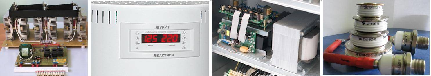 Во многом по этой причине тиристоры многими считаются более надёжными, имеют длительную гарантию производителя. - Т.к. у тиристорных моделей ключи более компактные, то их можно больше разместить в одном стабилизаторе.