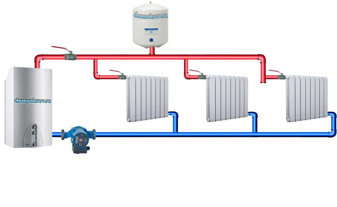 Намного сложнее смонтировать систему отопления с принудительной циркуляцией. Разница заключается в создании повышенного давления в магистрали. Это способствует увеличению протяженности трубопроводов и оптимальному температурному режиму работы всей системы.