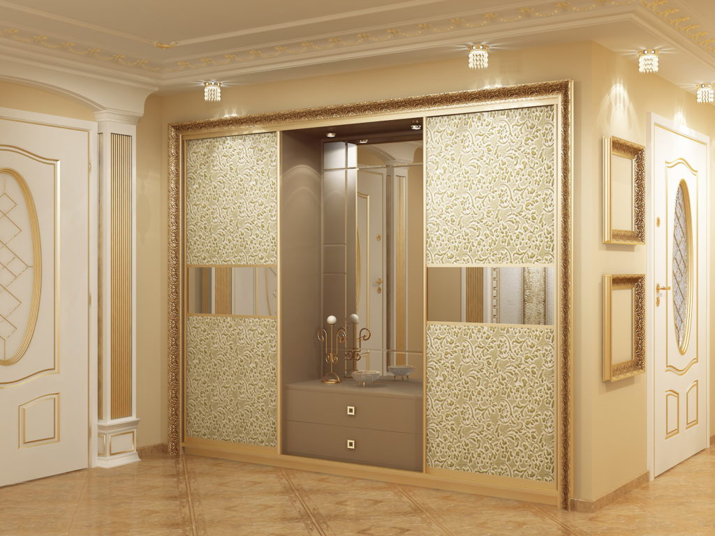 В случае, когда прихожая имеет большие габариты, в закрытой гардеробной можно устроить свой небольшой будуар. Можно расположить зеркало или даже установить трюмо. Но, такой вариант должен быть хорошо продуман заранее, правильно распределено пространство и обустроены функциональные зоны.