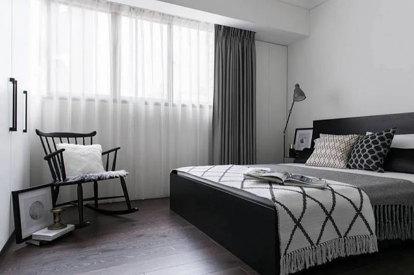Излишек света в спальне нежелателен, поскольку человек в данном помещении спит, и ничто не должно мешать его сну. Но скандинавская стилистика запрещает вешать утяжелённые полотнища. Вследствие этого, оформляя спальню, стоит следовать тем же правилам, что и при обустройстве гостиной. Уберечь комнату от солнца и чужих взоров помогут жалюзи.