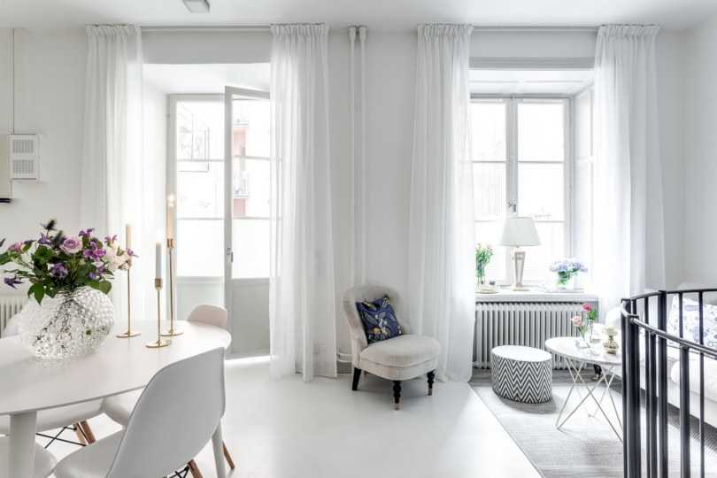 Хорошо драпирующиеся шелковые шторы на больших окнах шведской квартиры