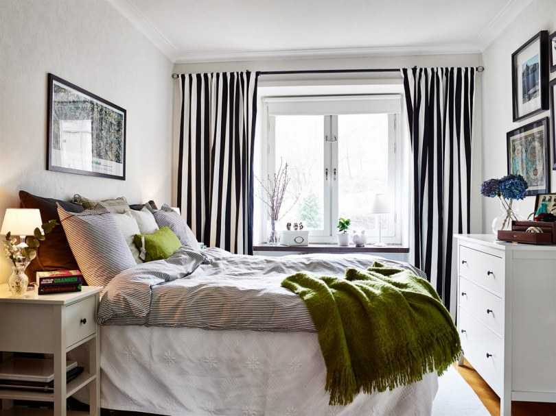 Для спален правила такие же, что и в остальных комнатах, несмотря на то, что иногда по утрам хочется дольше понежится в кровати. Но всё равно не стоит укрываться от солнечных лучей, поэтому выбирайте прозрачные текстуры и ажурные материалы. Не останавливайтесь в выборе цвета, ведь для спальни приемлемы все оттенки. А вот от посторонних глаз, если Вы живете на первых этажах, Вас защитят жалюзи, которые в скандинавских странах вешают вместе со шторами. Так создается не только лёгкость и невесомость в комнате, но и необходимая интимность и защищенность.
