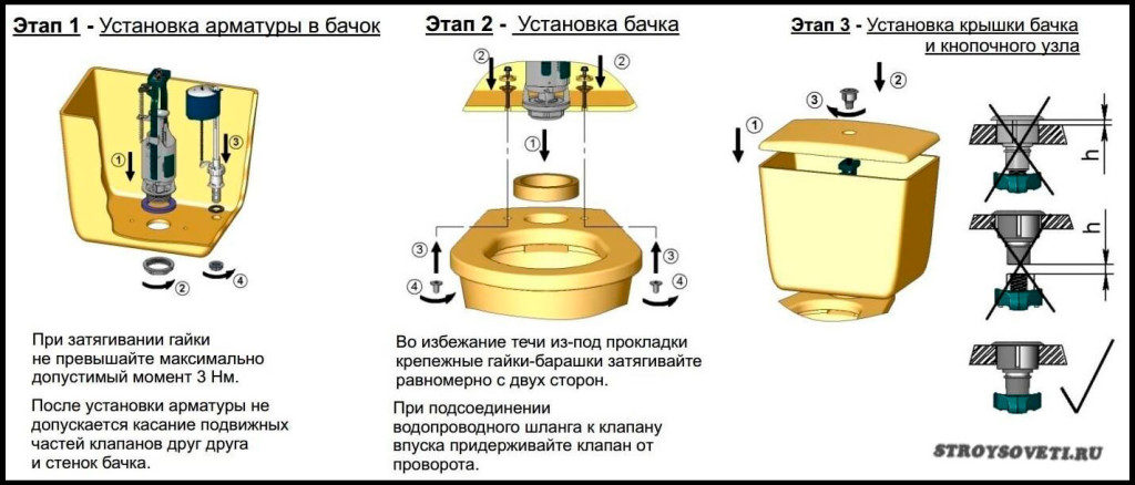 Существующие конструктивные различия вариантов бачков и их «начинки» обуславливают небольшие отклонения от алгоритма, хотя практически все бачки сконструированы по подобным схемам, поэтому монтируют арматуру бачка именно так.