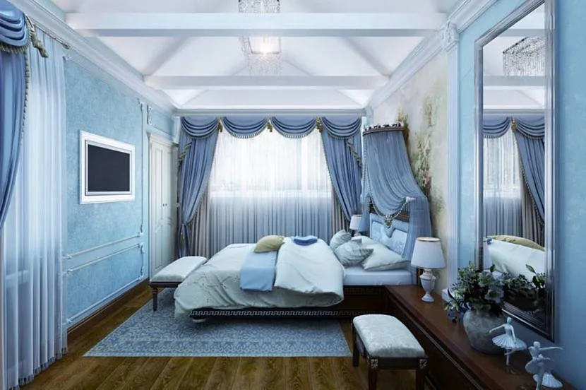 При подборе текстиля и штор в голубую спальню стоит помнить, что ткани более светлых оттенков, чем доминирующий цвет, добавят дополнительной прохлады и свежести, а сливовые или бежевые тона добавят свою долю нежности, теплоты.