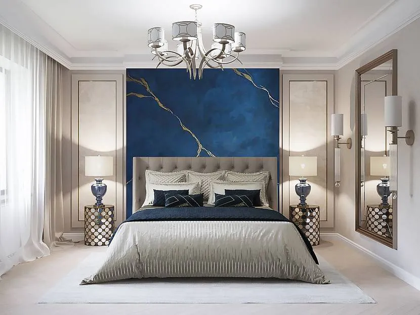 Небесные тона в комбинации с золотыми вкраплениями придают обстановке торжественности и некой помпезности. Золотистые акценты требуют аккуратного и умеренного использования, чтобы не перенасытить интерьер спальни.