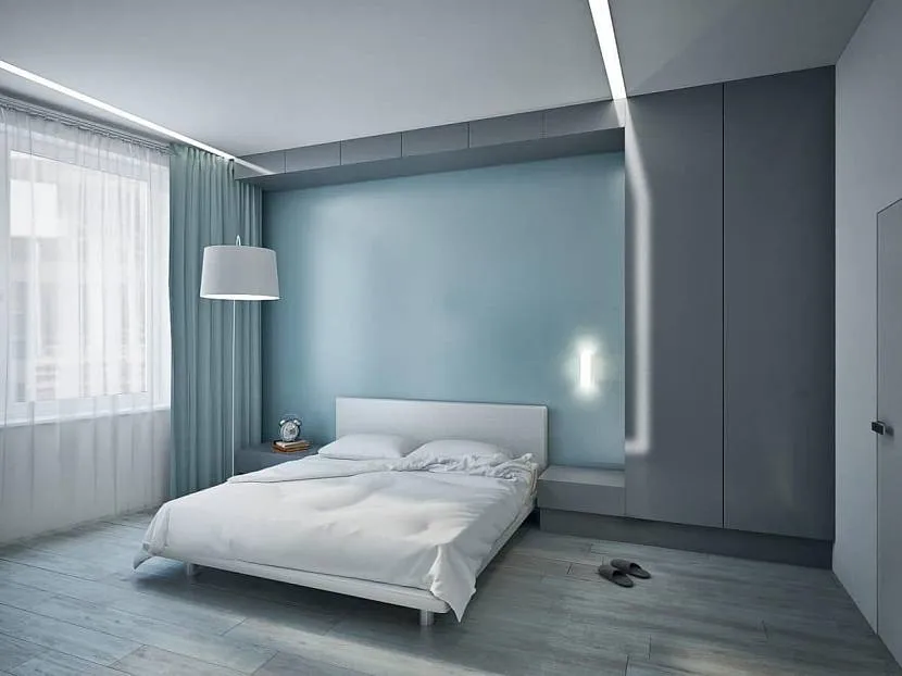 При проектировании маленькой спальни, безусловно, разумнее всего будет обратиться к ярким оттенкам, например, к голубому, который оптически расширяет интерьер. Если у спальни большая площадь, можно выбрать более темный цвет, например, темно-синий.