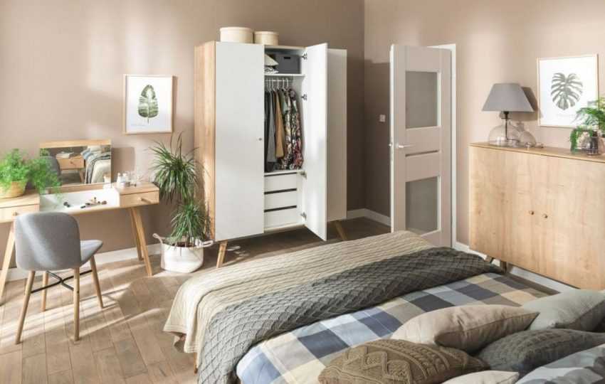 Зона гардероба в спальне легко обустраивается при помощи шкафа-купе или стенки, одна или две секции которой отведены под шкаф.