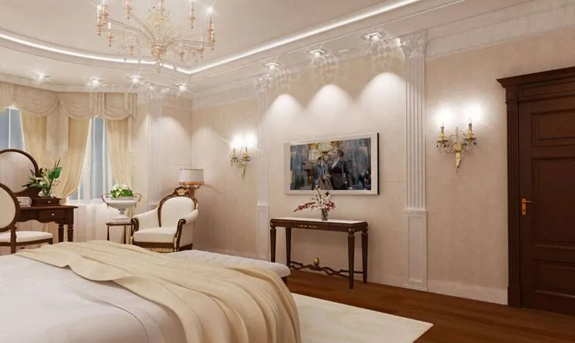 Интерьер с обилием украшений и ниш подсвечивают точечными элементами. Светильники размещают по периметру потолка. Если кровать утопили в алькове, то углубление обязательно освещают. Книжные полки (стеллажи), зеркало и картины лучше воспринимаются при дополнительной подсветке.