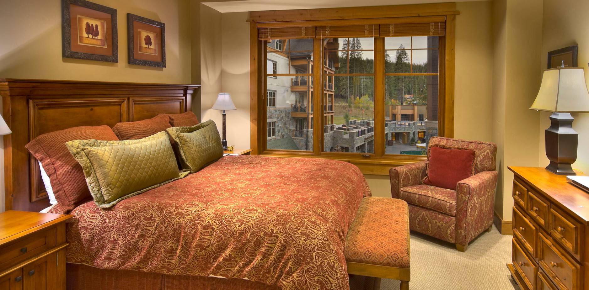 Наоборот, такая спальная комната элегантная и роскошная. Как этого добиться? При помощи украшения поверхности стен картинами, статуэтки разместив на комоде.