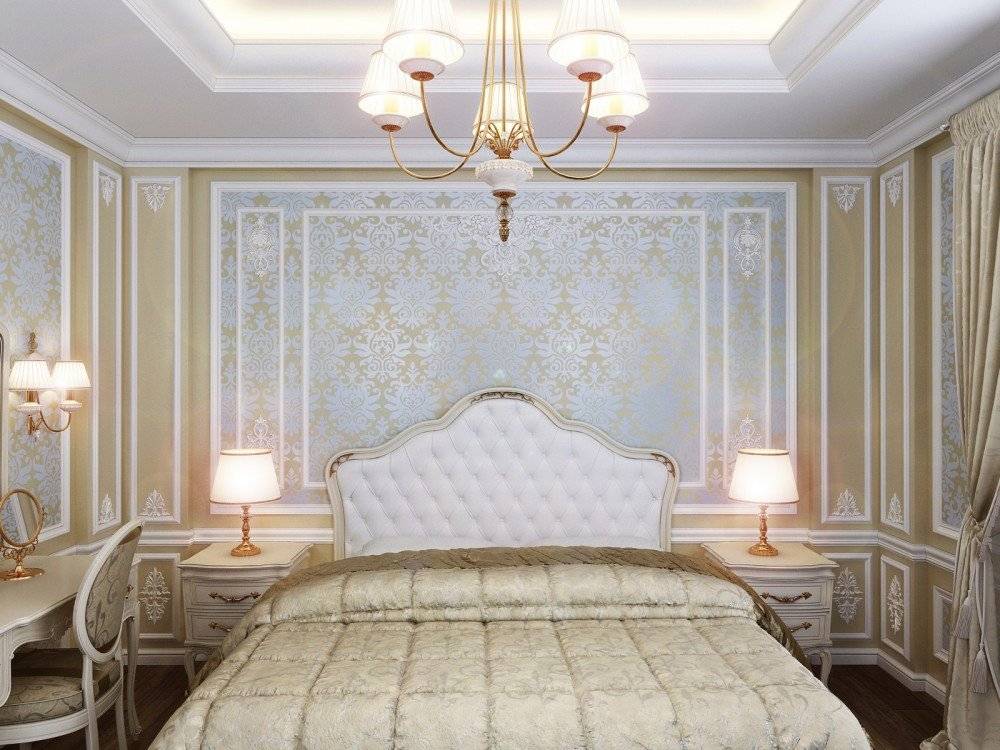 В спальне для женщин преобладают светлые и тёплые оттенки. Обязательно наличие зеркал и туалетного столика. Лепнина и объёмные молдинги придадут комнате романтизма и торжественности.
