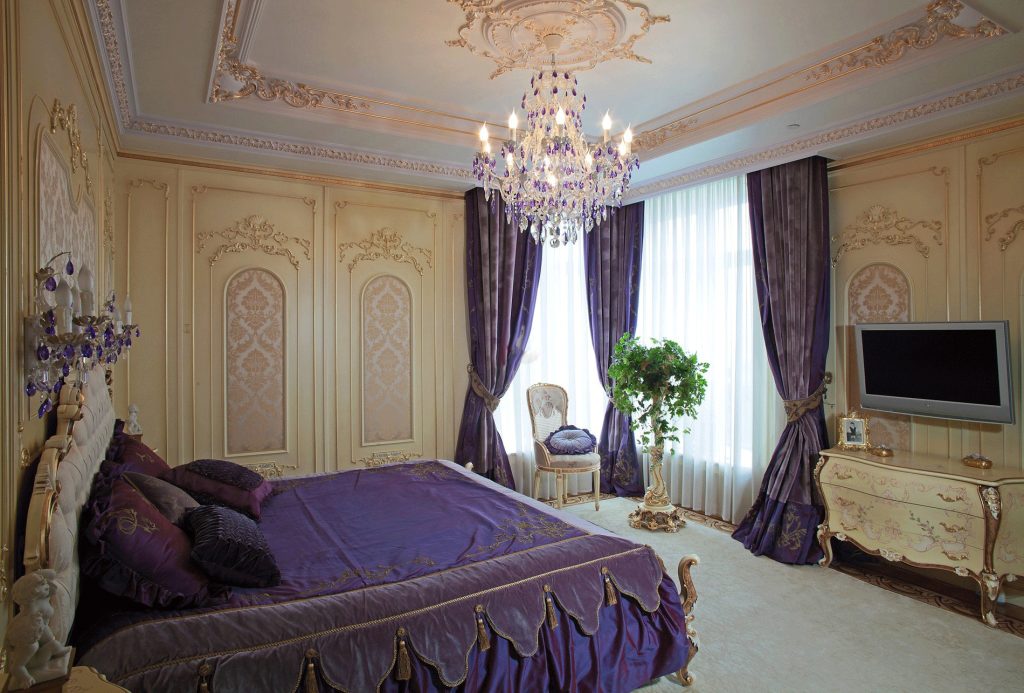 Классическая спальня имеет характерные элементы декора, по которым описываемый стиль легко читается. Без использования этих деталей интерьер не будет иметь законченный вид.