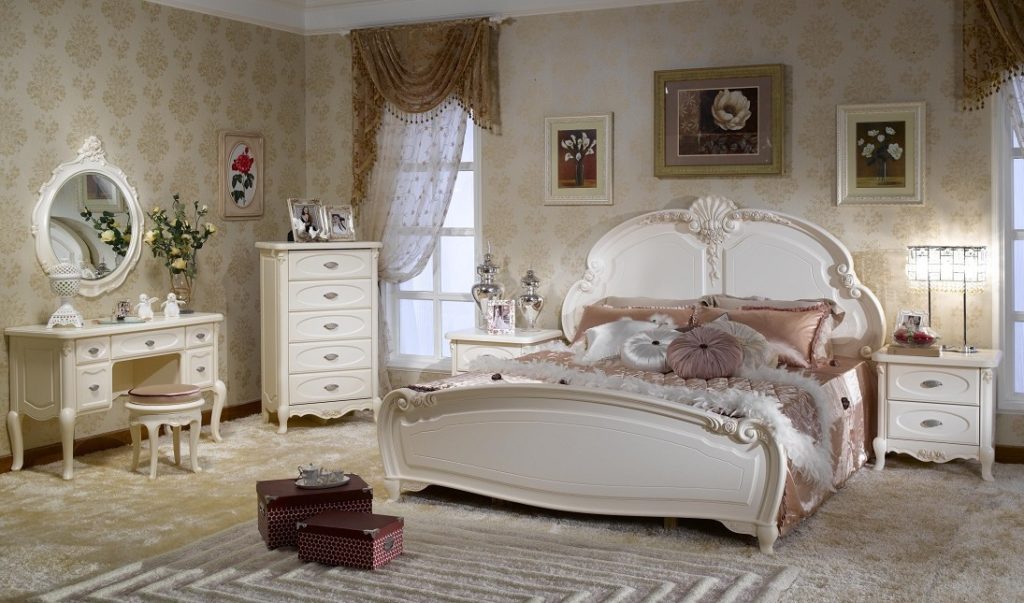 Основным атрибутом является кровать. В большой комнате она может иметь балдахин. Массивная деревянная мебель светлого или тёмного окраса имеет плавные изгибы, которые часто украшены перламутровыми или золотыми вставками. Такое ложе выполняет единственную функцию — способствует отдыху души и тела. Подъёмные механизмы и встроенные ниши не характерны для роскошной классики.