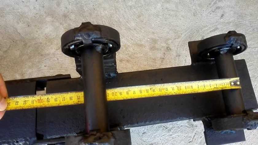 - для монтирования валов потребуется просверлить несколько отверстий. Ножки буквы П находятся на расстоянии друг от друга, чуть большем, чем высота валов. К верхней планке конструкции приваривают ручку, длиной около 25 см, на которую впоследствии надевают трубку-рычаг;