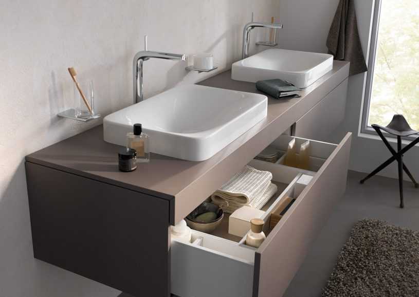 - Встраиваемые раковины врезаются в столешницу тумбочки. Это популярная модель имеет большие бортики, что позволяет защитить столешницу и тумбу от повреждения. Смотрятся модели очень органично, изысканно и в то же время просто. Они поддержат любой стиль интерьера, начиная с классики и заканчивая ультрасовременным минимализмом.