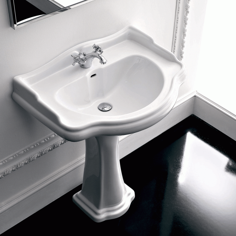 В отличие от подвесных вариантов, конструкция имеет опору, которая бывает монолитной (одно целое с раковиной) или отдельной. В этой ножке можно легко спрятать коммуникации, трубы, сифон. Определенное неудобство состоит в том, что изделия имеют фиксированную высоту, и изменить ее можно только путем надстройки постамента. Классическая высота составляет 70-80 см.
