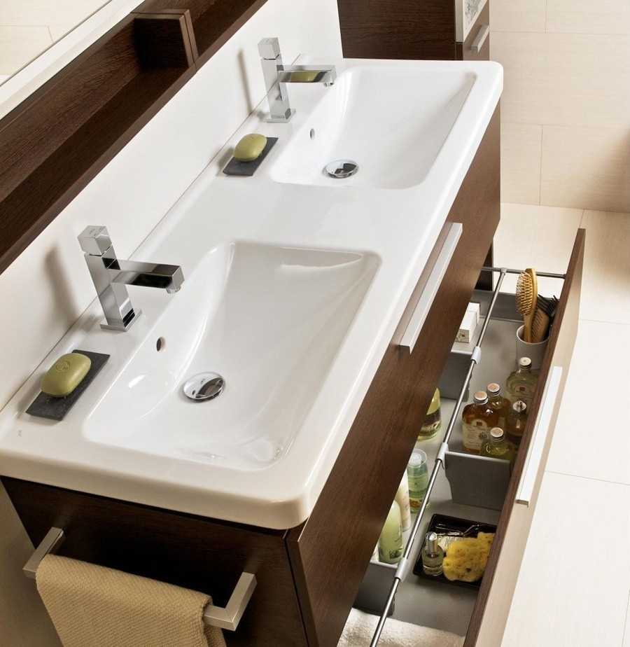 Встроенные модели располагают как в столешнице мебели, так и в отдельной тумбочке, где скрыта вся система труб. Подобные модели рекомендуется подбирать для достаточно просторных ванных комнат, поскольку подобный комплект мебели и сантехники имеет большие размеры.