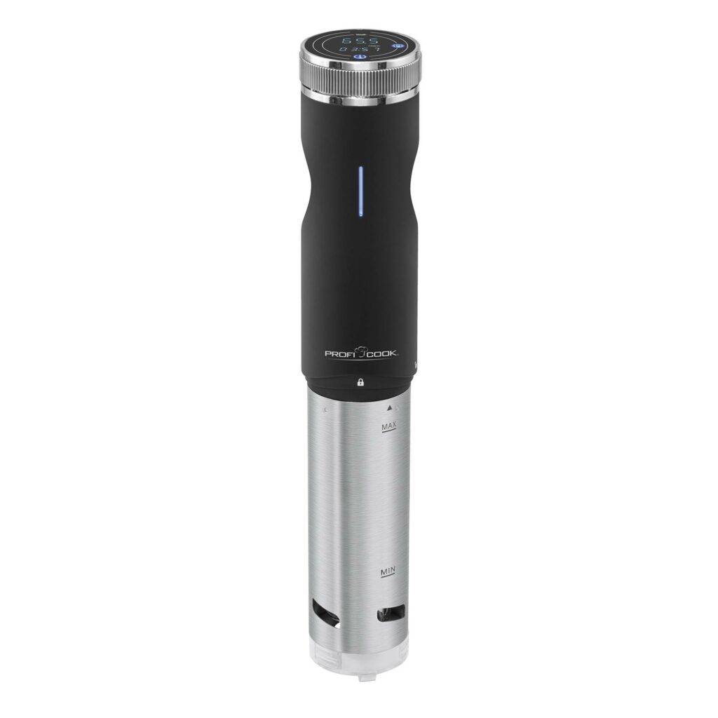 Прибор от компании Proficook оснащён несколько лучше, по сравнению с первыми двумя образцами. Прибор оснащён сенсорным управлением, а также ярким и информативным дисплеем с демонстрацией двух температур – текущей и требуемой. Диапазон регулирования температуры находится между 0 и 99 градусами, с погрешностью до 0.5 градуса. Таймер рассчитан на 99 часов работы, имеет звуковой сигнал для оповещения о готовности блюда. Равномерность нагрева воды обеспечивается встроенным насосом, способным пропустить через себя до восьми литров воды в минуту.
