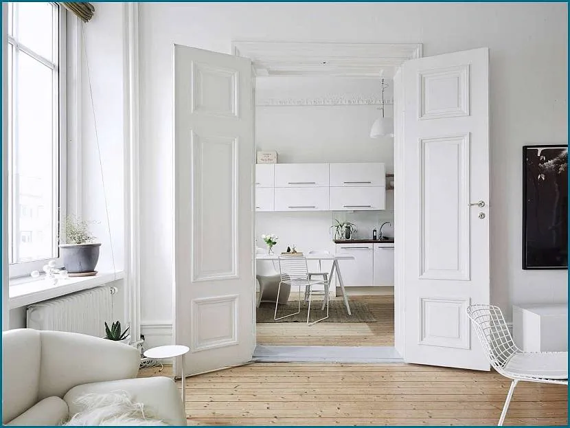Белые проёмы используются во многих стилях, современный скандинавский стиль подарит ощущение воздушности. Замечательно подойдут полы цвета натурального дерева, они подчеркнут белизну стен и двери.