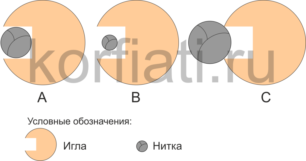 Если игла будет слишком толстой, нить будет находиться в желобке слишком свободно и возможен пропуск стежков и повреждение нити (рис. 1B).