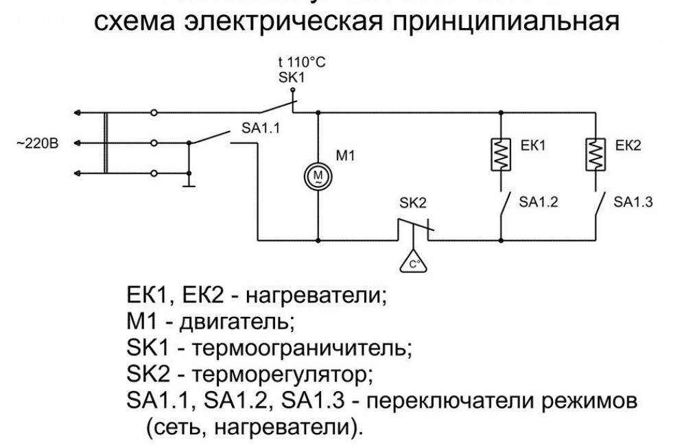 - Двигатель и спираль подключаются к выключателю. Схема предусматривает отдельное подключение.