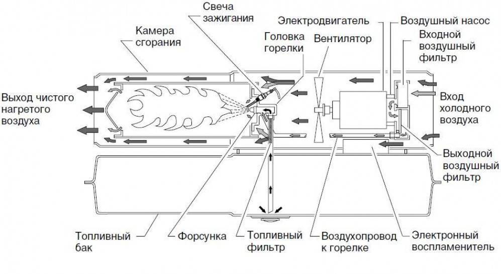 Принцип работы каждого из них схож: холодный воздух помещения захватывается вентилятором и поступает к нагревательному элементу, который обогревает и выпускает его уже горячим наружу.
