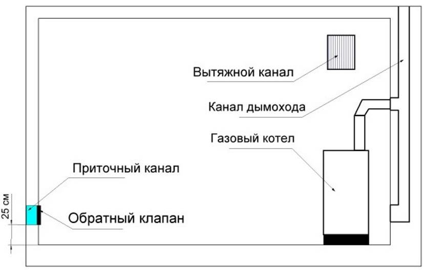 Вентиляционная система, как и дымоход, необходимы для нормальной, бесперебойной работы отопительной системы, а также для предотвращения аварийного возгорания или взрыва. Они оборудуются отдельно, а для поступления свежего воздуха монтируется принудительный вентканал. Входное окошко располагается внизу входной двери или наружного перекрытия, его размер составляет минимум 1/30 всей площади комнаты. С целью предотвращения циркуляции воздуха не допускается перекрытие вентиляционных каналов.