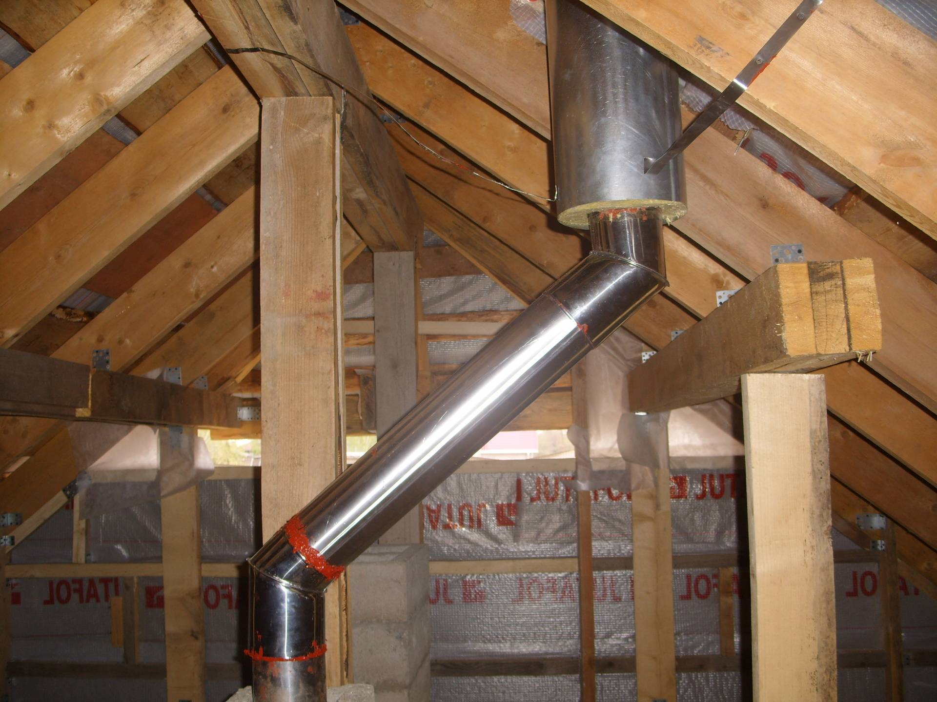 Как было отмечено выше, проход через кровлю со стропильной системой выполняют максимально близко к коньку. Тогда, наибольшая часть трубы будет оставаться в чердачном пространстве, под защитой от перепадов температуры и ультрафиолета. Всей трубе будет не страшен резкий ветер, так как только меньшая ее часть будет выходить наружу.