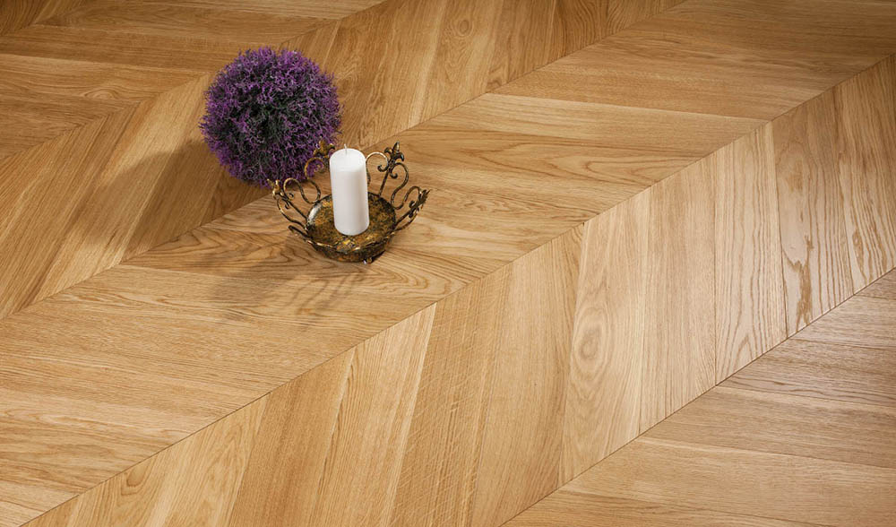 Укладка «английской ёлкой» применяется как на всей поверхности пола, так и в качестве бордюра к художественным вставкам. Такой узор дает чёткий геометрический рисунок за счет прямоугольного направления волокон древесины каждой плашки.