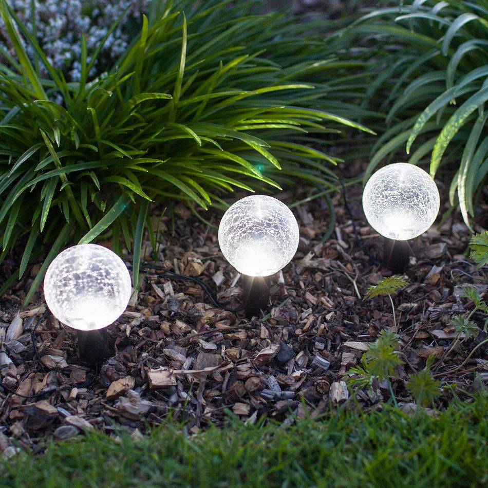 Стеклянные сферические светильники с мерцающей золотистой подсветкой хорошо смотрятся не только вдоль дорожек, но и хаотично установленные на газоне или зарослях сада