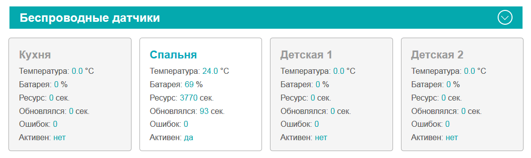 На скриншоте видно, что в данный момент три датчика выключены и работает только один датчик температуры в спальне. Датчик сообщает системе, что заряд его батареи составляет 69 %, ресурс (интегральное время работы) составляет 3770 секунд или 62,8 минуты, последний раз его показания обновлялись 93 секунды назад и что ошибок связи с ним 0, т. е. качество связи отличное.