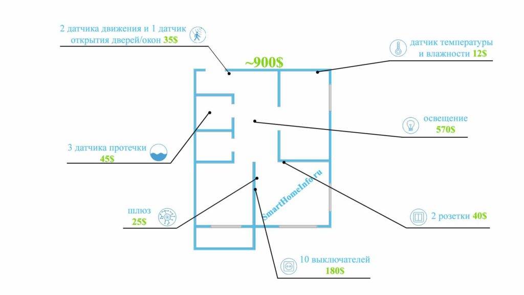 В итоге у нас вышло около 900$. За эти деньги мы сможем полностью оборудовать квартиру умным светом, заменить все выключатели, добавить несколько розеток, а также все основные датчики и шлюз: