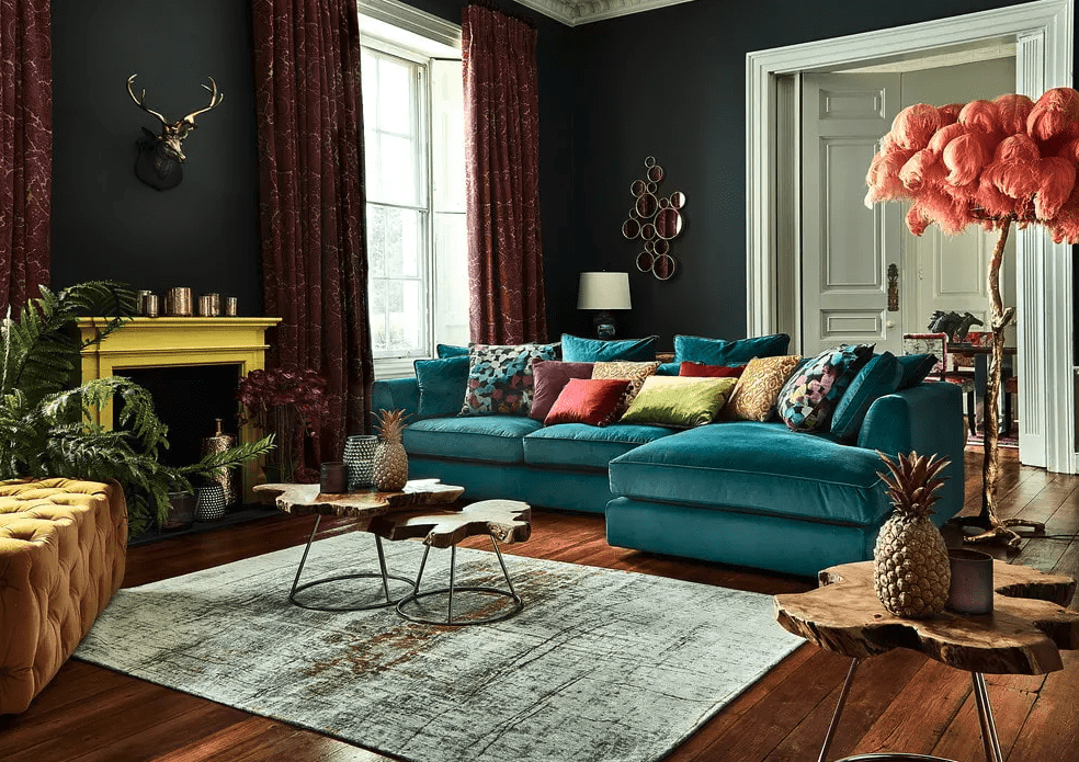 - Эффектная мебель. Обстановка в этом стиле сочетает в себе физический и визуальный гедонизм. Большие, яркие, богато украшенные, но в то же время шикарные и невероятно удобные кресла, диваны, банкеты и пуфы хорошо сочетаются с резными обеденными столами и необычными стеклянными столами с акцентом;