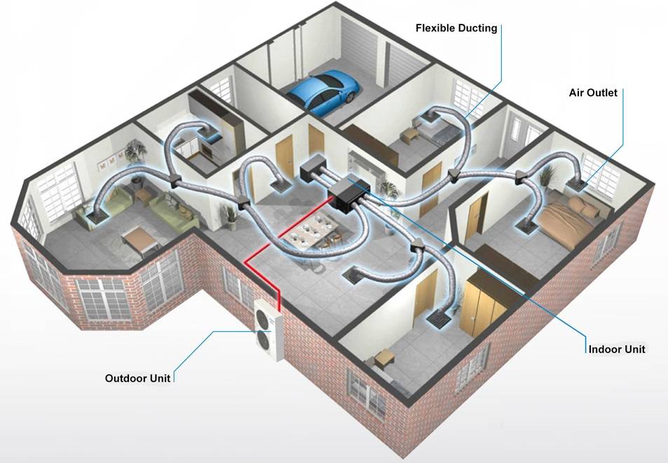 Сплит системы монтируются за подшивным, подвесным потолками, которые полностью закрывают внутренний блок оборудования. Распределение теплого или холодного потоков воздуха осуществляются по теплоизолированным воздуховодам, которые тоже ставят в межпотолочном пространстве. В результате такие конструкции хорошо охлаждают сразу несколько комнат.